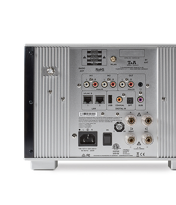 Die Anschlusssektion der Rückseite ist ein eindrucksvolles Symbol der Vielseitigkeit des Caruso R. Vom ersten Tag seiner Entwicklung wurde der Caruso R als das Zentrum einer hochwertigen und vielseitigen HiFi-Anlage gedacht. Dabei durften Quellen keine Begrenzung darstellen: Analoge und digitale Eingänge erschließen die komplette musikalische Vielfalt von Plattenspieler mit Phonovorverstärker bis zu TVs oder Set-Top Boxen. Die Brücke zu mobilen und Netzwerkquellen schlagen seine verbauten USB-Eingänge sowie die LAN, WLAN und Bluetooth Anschlüsse, deren Signale der T+A Streaming Client SC 100 umsetzt. Der SC 100 wurde erstmals im Caruso verwendet und bietet Zugang zu Diensten wie Gracenote Music ID, Airable Music Services, Spotify Connect, Apple AirPlay sowie Amazon Music über Alexa. Die Fähigkeiten des Internets werden nicht mehr nur genutzt – sie werden potenziert.