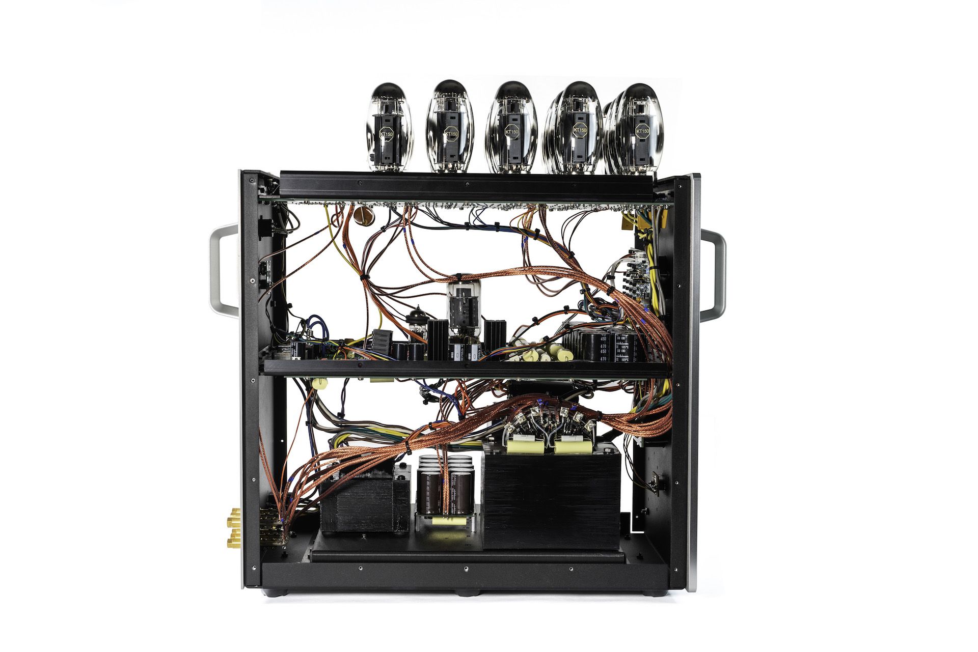 Dies wird durch die Verwendung eines massiven, speziell angefertigten Leistungs- und Ausgangstransformators erreicht, der Strom von sechzehn KT150-Vakuumröhren in jedem Kanal liefert.
