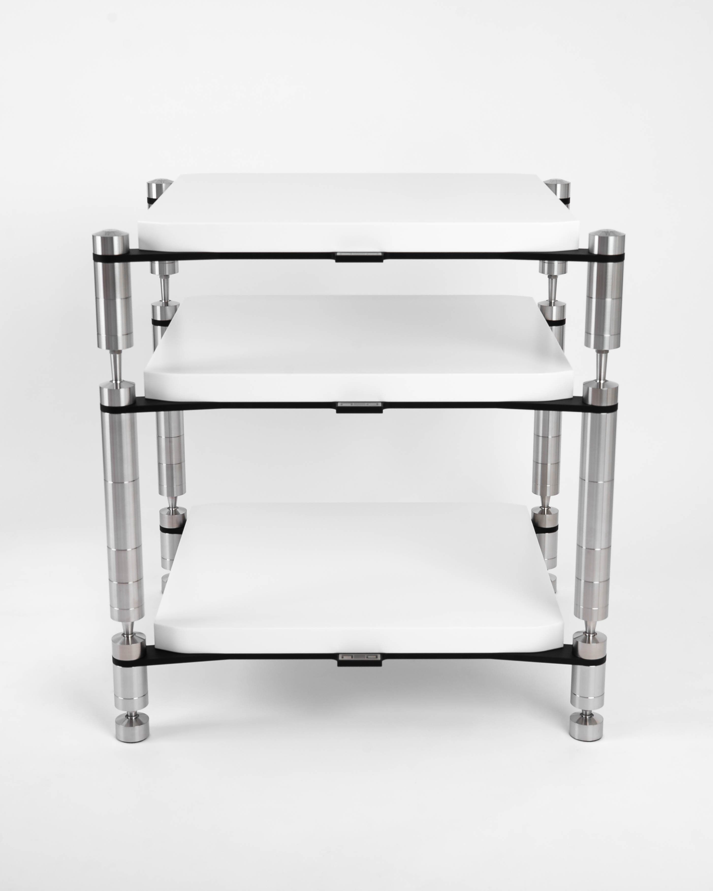 Anschließend werden weitere Fachböden auf das Basisteil gestapelt. Diese Regale sind mit massiven Stahlbeinen ausgestattet, die mit Anti-Resonanz-Ball-Tips mit hoher Tragfähigkeit versehen sind.