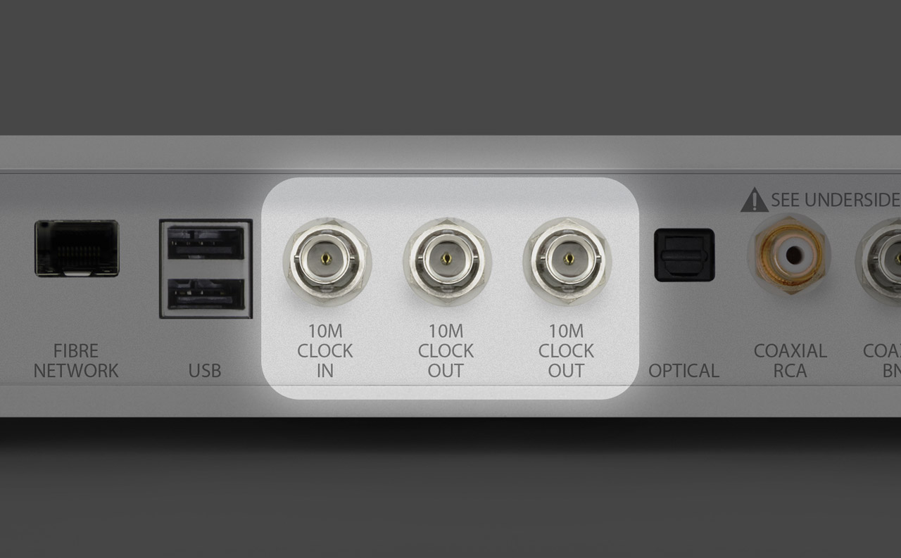 Zwei 10-MHz-Clock-Ausgänge bieten Flexibilität bei der Synchronisierung mehrerer digitaler Audiogeräte und ermöglichen eine Master-Clock-Konfiguration, bei der ein Gerät die Taktung der anderen vorgibt. Dieser Ansatz kann helfen, Jitter zu minimieren, indem sichergestellt wird, dass alle Geräte mit einer konsistenten und stabilen Taktreferenz arbeiten.
