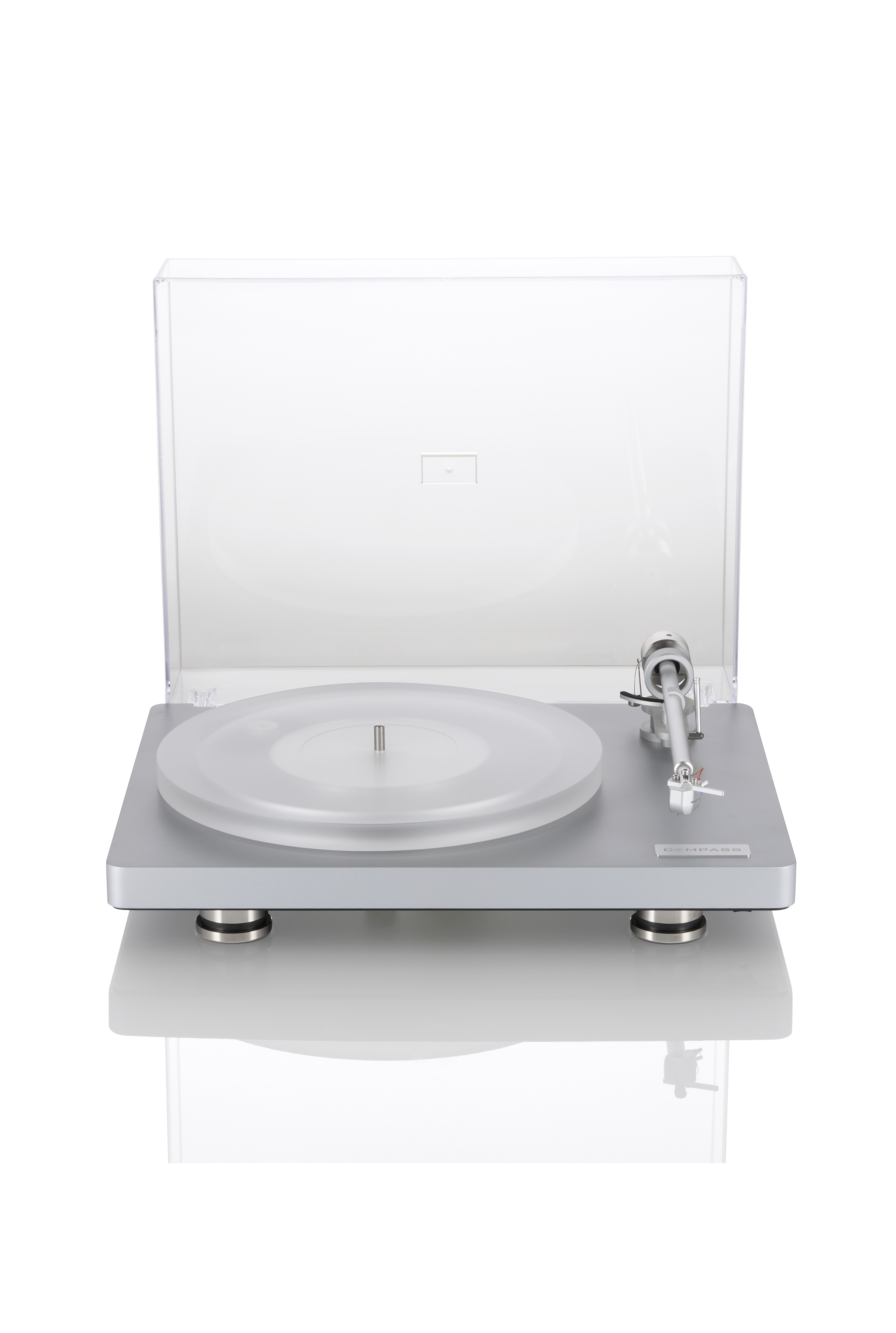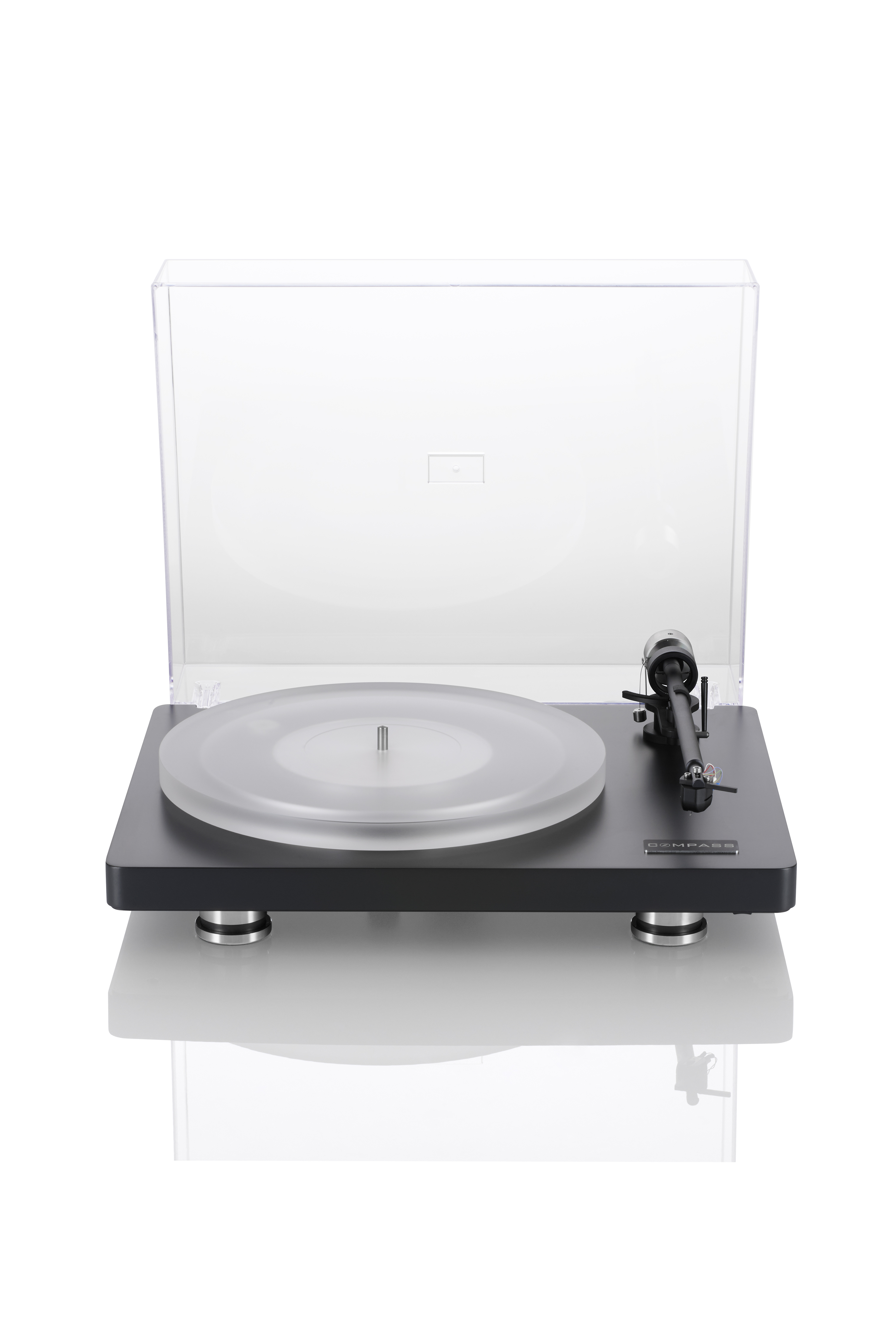 Der compass überzeugt nicht nur klanglich, sondern auch durch seine klare Formensprache. Erhältlich in den Farben Schwarz und Silber, verbindet sein Design puristische Eleganz mit technischer Raffinesse. Die massive Stahlplatte auf der Unterseite sorgt für Stabilität und unterstützt das resonanzarme Spielverhalten. Eine hochwertige Acrylhaube mit Edelstahl-Gelenken schützt den Plattenspieler, ohne das Design zu stören.