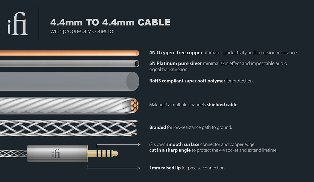 Das iFi 4,4 mm bis 4,4 mm Kabel verwendet schwere OFHC-Stranggusskupfer-Silbermatrixleiter mit 14 AWG für die beste Signalübertragung.