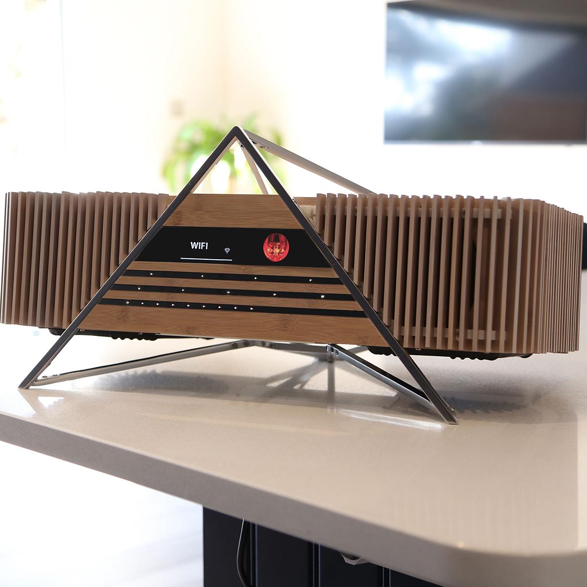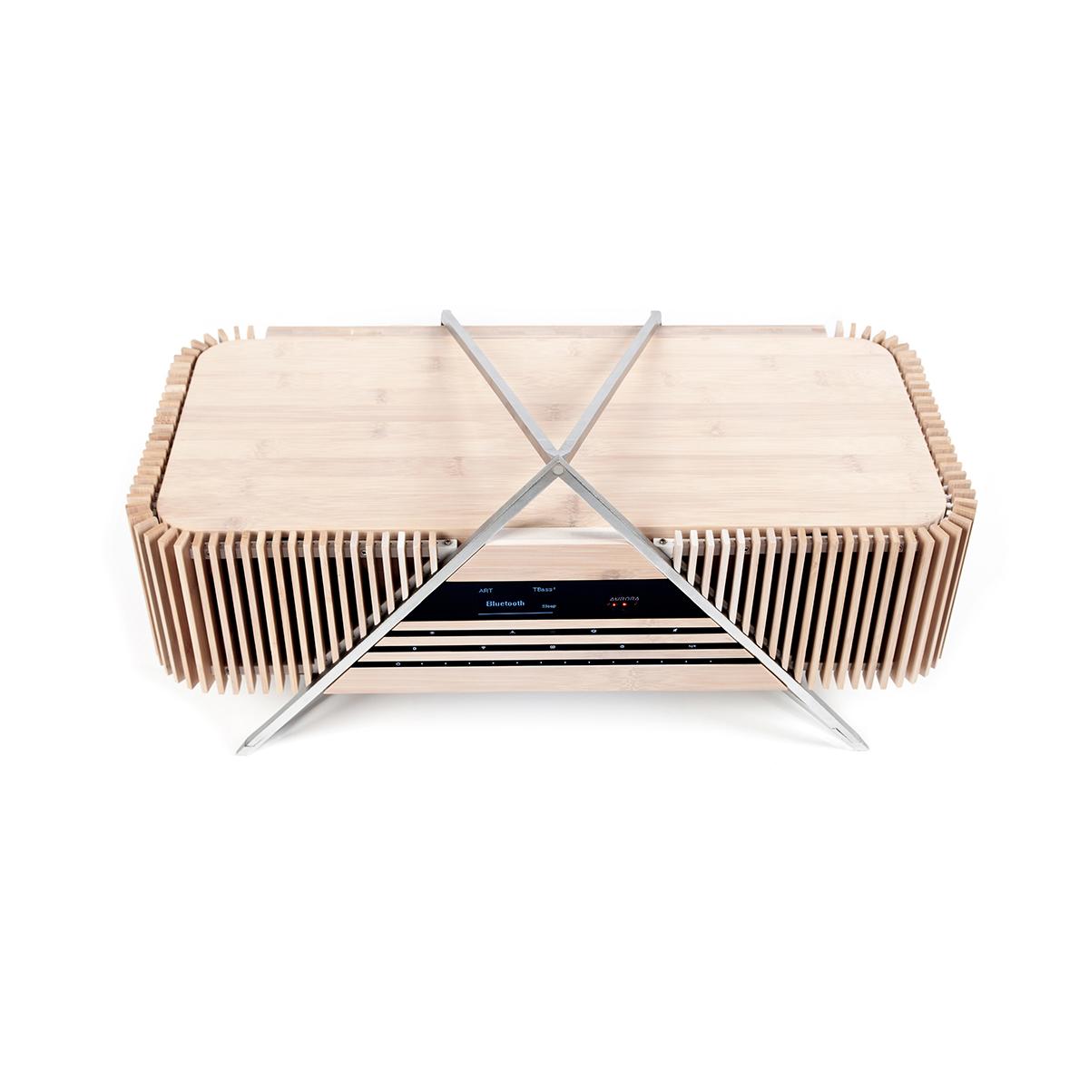 Sein Design besticht durch einen markanten Aluminiumrahmen, der für einen stabilen Stand sorgt, einer Verkleidung aus Bambus, einem berührungsempfindlichen Bedienfeld und einem hervorragendem OLED Display. Sechs Lautsprechertreiber unter der Bambus Verkleidung und 2 Basstreiber auf der Geräteunterseite sorgen für eine hervorragende Abstrahlcharakteristik.