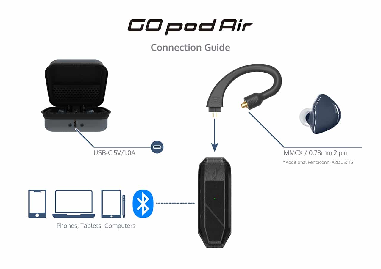 Das GO Pod Air verfügt über innovative Lebensqualitätsfunktionen, um maximale Kompatibilität mit der großen Auswahl an verfügbaren IEMs zu gewährleisten. Wir verfügen über eine Reihe austauschbarer Ohrschlaufen für nahezu jedes erdenkliche IEM – 2-polige und MMCX- Ohrschlaufen werden standardmäßig mit dem GO Pod Air mitgeliefert, außerdem sind die Optionen T2 , A2DP und Pentaconn Ear verfügbar.